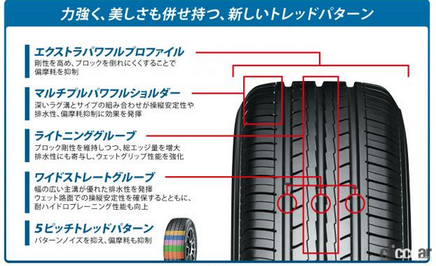 BluEarth-ES ES32は、安定した走行性能と安全なハンドリングを実現する、幅広で四角い、強力なプロファイルを備えた新しいトレッドパターンが特徴です。