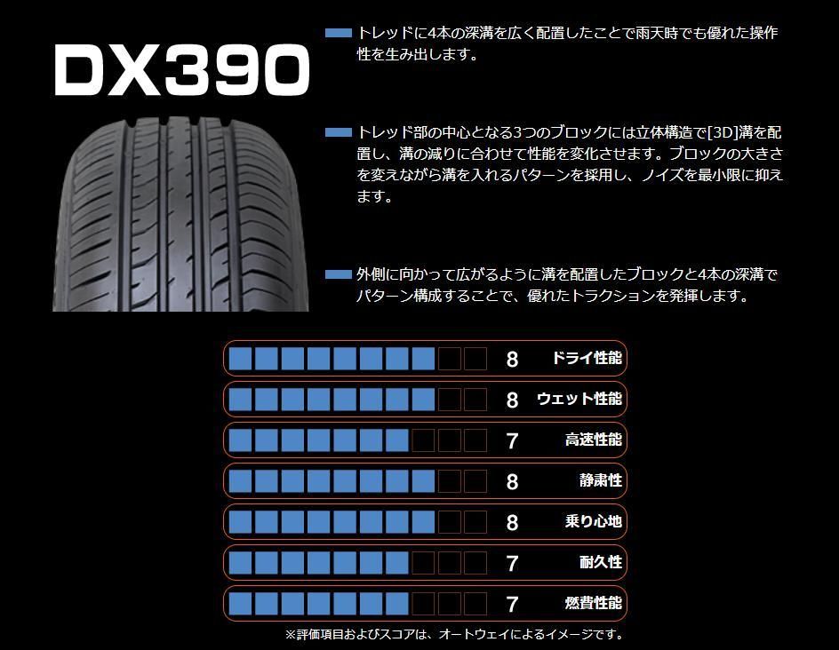 ■DX390(ディーエックスサンキュウマル)は、排水性に優れ、雨天のハンドリングに定評があり、非対称のトレッドデザインが熱効率と走行ノイズを最小限に抑え、快適なドライブを提供します。