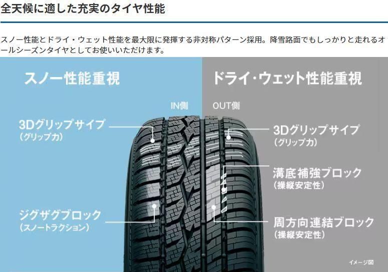 スノー性能とドライ・ウェット性能を最大限に発揮する非対称パターン採用。降雪路面でもしっかりと走れるオールシーズンタイヤとしてお使いいただけます。