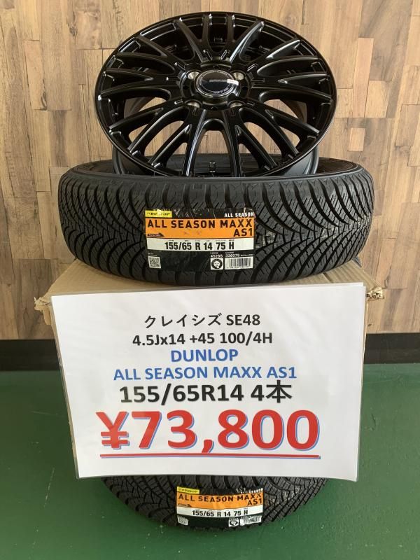 【平塚店】数量限定!特価価格!クレイシズ SE48 4.5Jx14 100/4H +45 ダンロップ ALL SEASON MAXX AS1 155/65R14 【取り付け工賃込み】